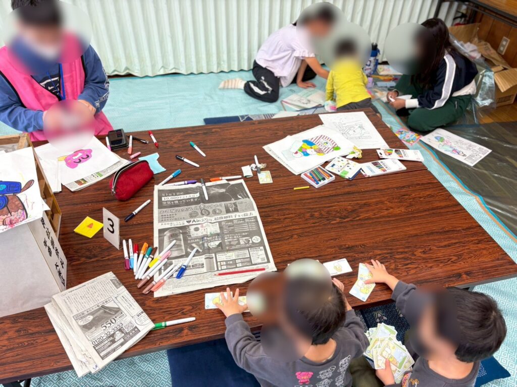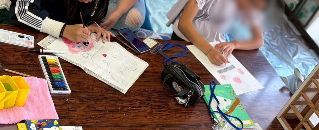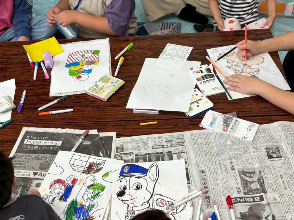 絵付けには、真っ白な紙から自由に書き始める子もいれば、事前に用意した下絵を塗り絵として楽しむ子もいて、それぞれのスタイルで取り組んでいました。