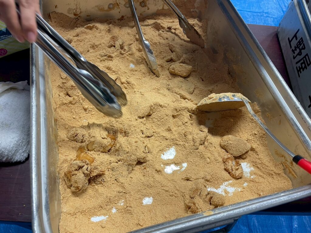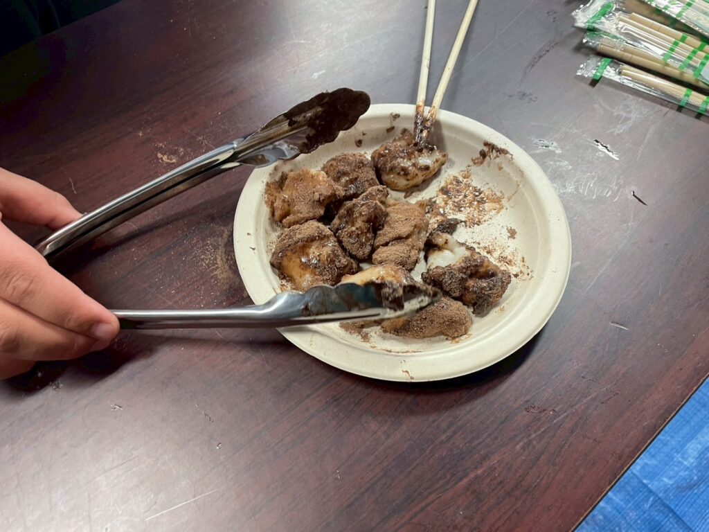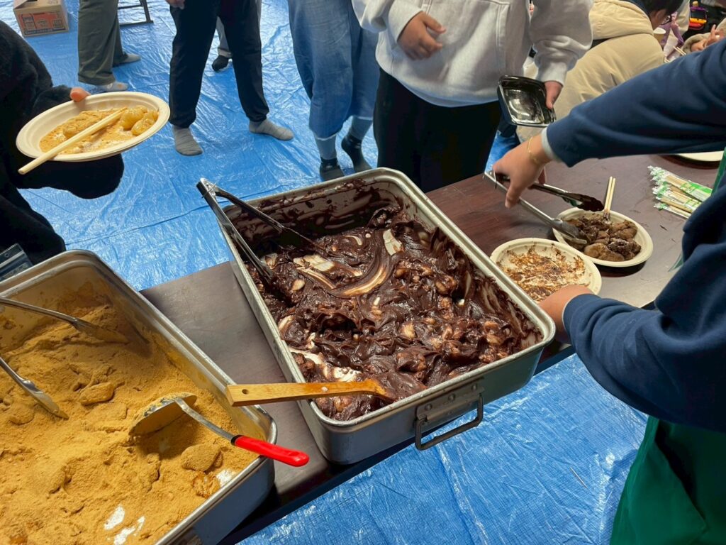 お餅はつきあがるとすぐにバイキング形式で提供され、参加者は好きな味付け(あんこ、きなこ、さとう醤油、ココアパウダーなど)を楽しみました。