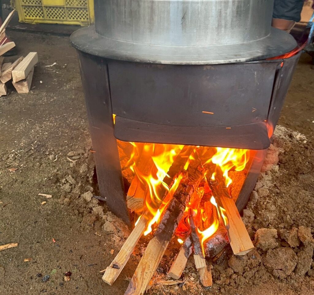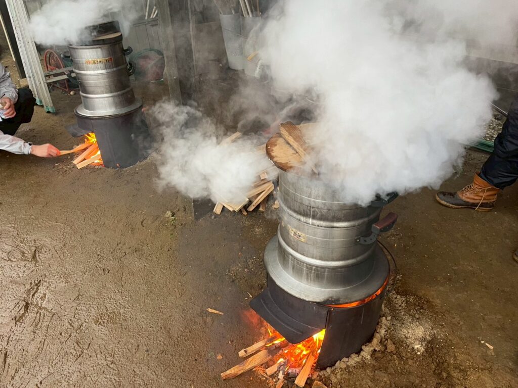 まずはお餅のもとになるもち米をかまどで蒸していきます。