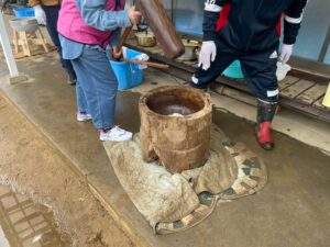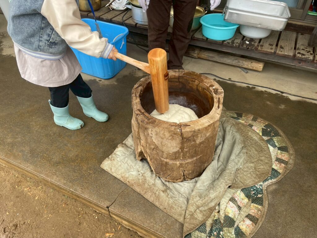 スタッフがある程度もち米をまとめたら、子どもたちに餅つき体験をしてもらいました。