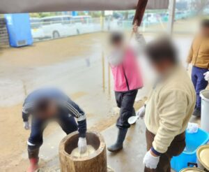 雨でしたが、元気な声が響き賑やかな雰囲気の中でお餅つき体験を行えました。