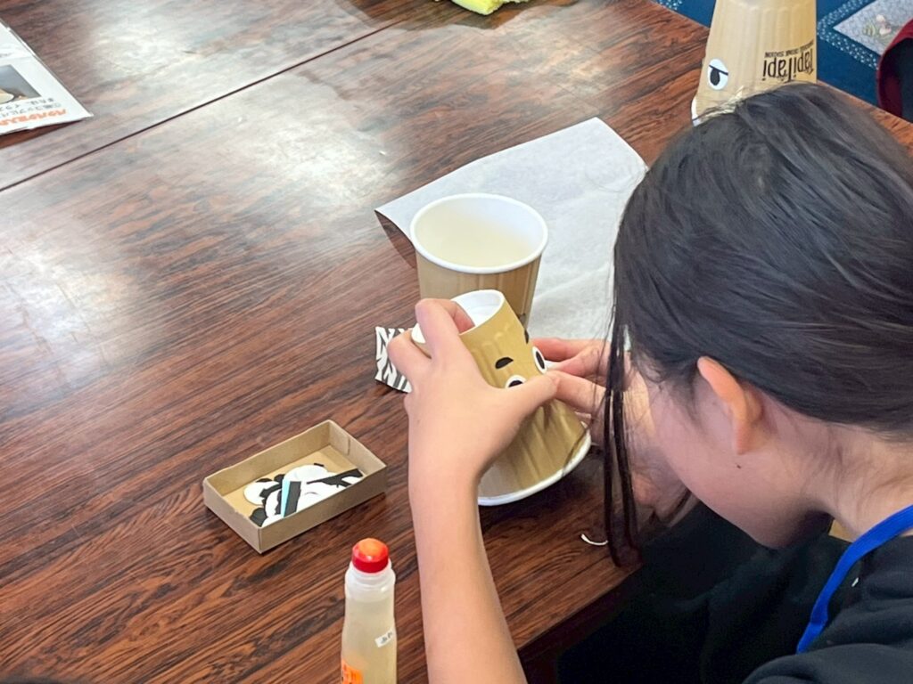 新聞紙で丸めて豆を作り、紙コップに自由に絵を描いたり、ハサミで切ったり貼ったりしてオリジナルの豆入れを作りました。